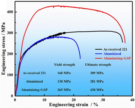 Coating and the dynamic recovery effect are other important factors affecting the high-temperature mechanical properties. Ghazani, M.S conducted tensile tests on AISI 321 stainless steel at different temperatures and strain rates of 0.001 s−1, demonstrating that dynamic recovery is the main softening mechanism at deformation temperatures of 800–900 °C, with partial recrystallization occurring at 950 °C. Complete dynamic recrystallization begins to occur when the deformation temperature reaches 1000 °C. The microstructure formed at a constant deformation temperature of 1100 °C is composed of equiaxed austenite grains, and the grain size increases with decreasing strain rate. A larger grain size means a lower tensile strength of stainless steel [15]. Döleker, K.M demonstrated the efficacy of an Fe-Al compound as a protective layer, noting the outstanding high-temperature stability and mechanical characteristics [45]. Yu, L conducted high-temperature tensile tests on AISI 321 stainless steel that had been treated with aluminizing and laser shock strengthening (LSP) at 620 °C. The resulting stress–strain curves are illustrated in Figure 13. The performance of AISI 321 stainless steel after aluminum plating decreased, while the tensile strength of stainless steel treated with aluminum plating and LSP increased to 400 MPa, and the performance of the processed steel was significantly improved [46]. The findings confirm that the residual stress imparted by LSP ensure the stability of 321 stainless steel in high-temperature conditions, enhancing high-temperature tensile properties by inhibiting crack propagation.