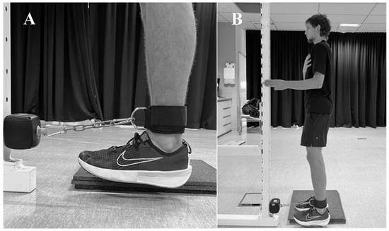 (A) Hawkin TruStrength attached to rack and participant’s ankle. (B) Participant set up for standing hamstring assessment.