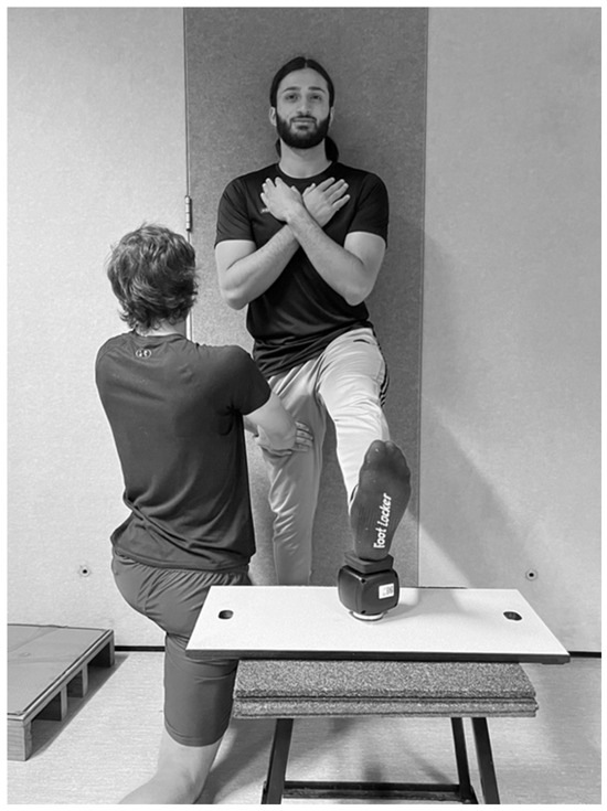 The HTS was attached to a base plate with a compression pad attached to the opposite side, as shown in Figure 1A. The participant was instructed to be in a standing position with their back, head and buttocks against the wall, arms placed across their chest, and the non-testing leg placed against the wall (see Figure 3). The participant was instructed to bring the hip of the leg being tested to 90 degrees. The base plate with the HTS attached was placed relative to the participant’s hip and knee angle to ensure the hip was at 90 degrees and the knee was at 20 degrees. This was measured by the first tester using a goniometer to ensure standardization and accuracy. The second tester used both hands and applied pressure to the leg against the wall to ensure the non-testing leg was against the wall, as shown in Figure 3. Once the participant was in this position, the first tester would instruct the participant to apply force ‘as hard and as fast as possible’ to ensure maximal force was reached immediately. Once 3 s had elapsed, the first tester instructed the participant to stop. If any compensatory movement was detected by tester 1 or 2, for example, rotation of the lumbo-pelvic region or loss of contact with the wall, the trial was considered invalid and was then repeated. The participant would then rest for 40 s before completing the next trial on the same leg. Each participant completed 5 trials per leg.
