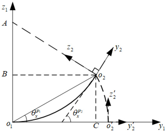 In the coordinate system of , it is observed that rotates around the x-axis. In the coordinate system of , it is sensed that its own p-frame rotates around the x-axis, as shown in Figure 3. In Figure 3, represents the center of ; represents the original center of ; represents the new center of after undergoing flexural deformation; and A is the center of the circular arc corresponding to the flexural curve, and the y-axes of both and are tangent to this arc segment. Therefore, the relationship between and exists: