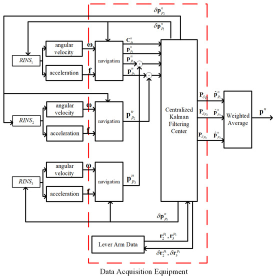 The computational flowchart of the centralized Kalman filtering (CKF) method based on topological distribution constraints proposed in this paper is shown in Figure 4. Three sets of SRINSs are installed at different positions on the carrier. While receiving the 1PPS synchronization pulse signal, they send out their own measured raw gyro data and accelerometer data. In the acquisition system, firstly, three SRINSs’ positions are calculated by their measurement information at the reception time. This position information is then substituted into the centralized Kalman filter equations. During the Kalman filtering process, the measurements are the position differences between and , and between and . After filtering, the estimated state information is used to compensate the calculated position information in each SRINS. In the acquisition system, the stored lever arms and the position information of each SRINS calculated by itself are compensated. After compensation, the variance in the estimated error is used to perform weighted averaging on the position information to obtain the final comprehensive position information.