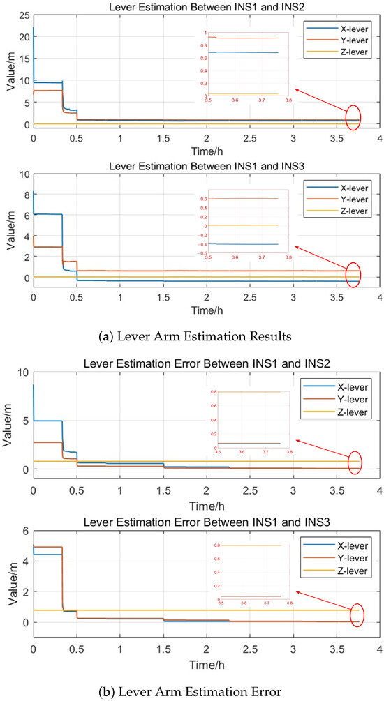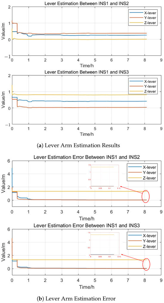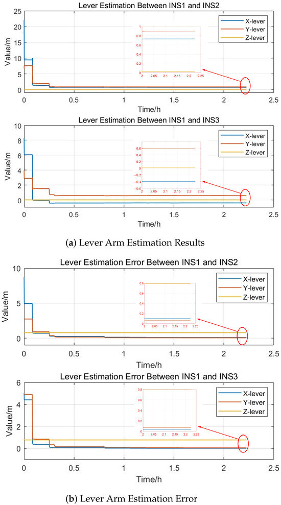 The estimation results of the lever arm are shown in Table 2. It can be seen that the arm length estimation error is small, and the estimation result is quite accurate. From Figure 6b, it can be seen that the estimation of the lever arm errors in the x and y directions is convergent. The lever arm between and , and between and can be estimated, thereby compensating for the lever arm errors during the data fusion process. Due to the divergence in the vertical direction of the INS, the observability of the arm length in the z direction is weak, resulting in poorer estimation results. However, for positional information such as longitude and latitude, the arm lengths in the x and y directions alone are sufficient to constrain the positions of multiple SRINSs.