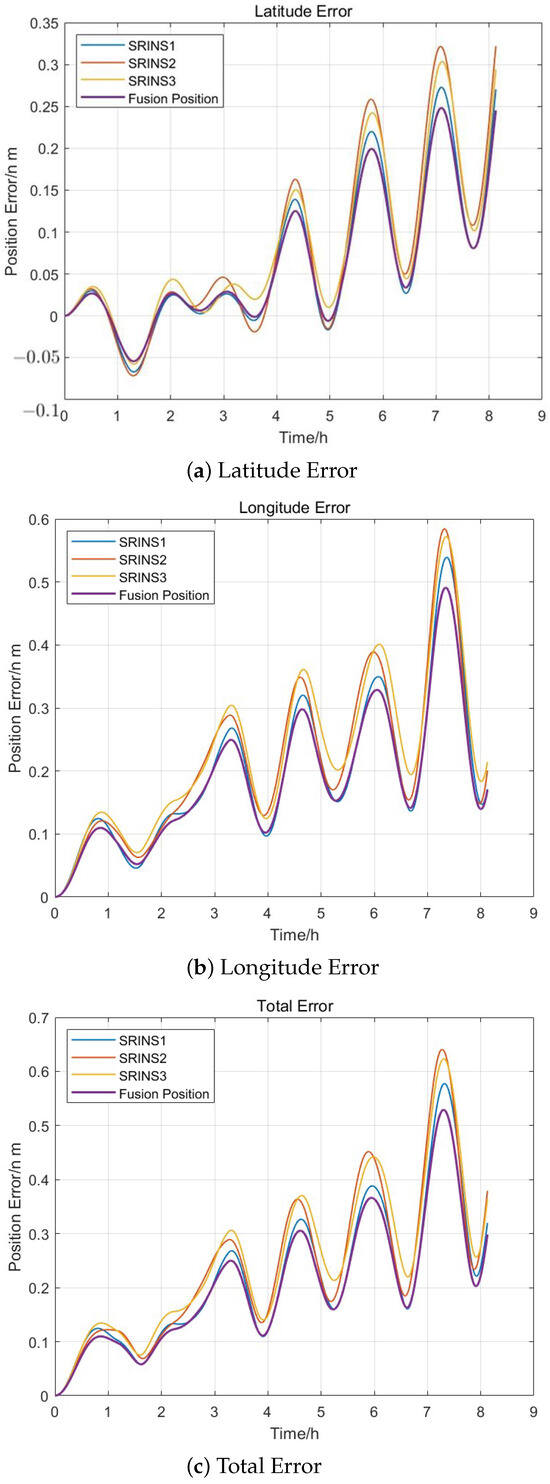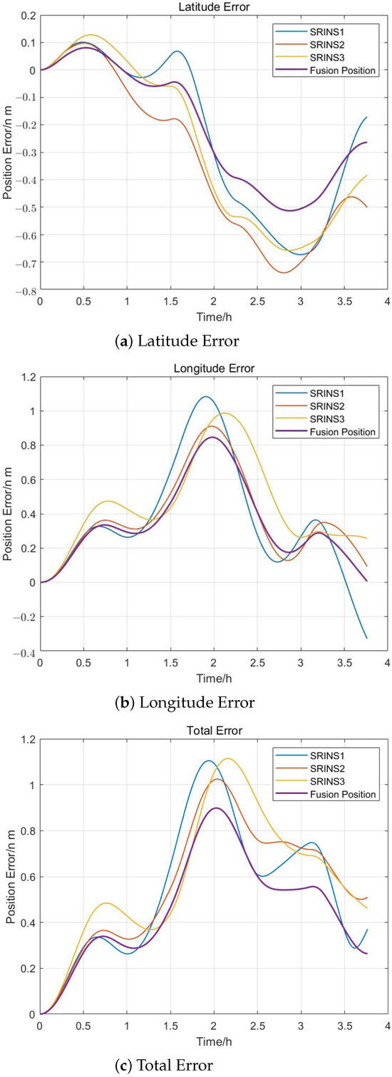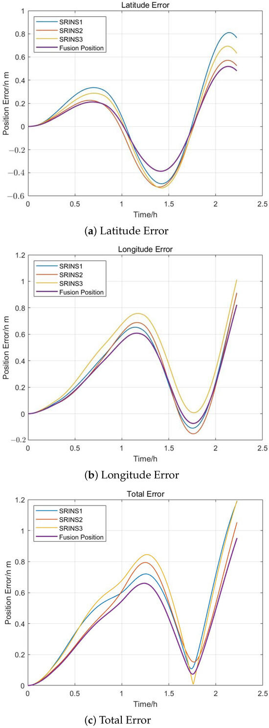 From Table 6, it can be seen that the longitude error is reduced by approximately 8.4360%; the latitude error is reduced by approximately 6.9174%; and the overall positioning accuracy is improved by approximately 9.9492%. Therefore, the multi-INS data fusion method proposed in this paper can form a position reference, and the accuracy of this position reference is superior to the accuracy when the three sets of SRINSs perform navigation calculations independently.
