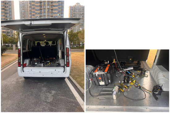 Three SRINSs were placed on an experiment vehicle. The installations of some instrumentation are shown in Figure 9 and Figure 10. To better evaluate the navigation results after data filtering and fusion, we integrated a satellite navigation system. The position data measured by this equipment will not be used in the filtering and fusion calculation process. This position information is only used as a high-precision reference for calculating positioning errors. During the experiment, the data acquisition system continuously sent 1PPS synchronization pulses to three RINSs and simultaneously collected raw gyroscope and accelerometer data from these systems, as well as positioning information from the Global Navigation Satellite System (GNSS). This ensured time consistency of the data during the vehicle tests. Two sets of vehicle tests were conducted, each lasting over 2 h. The routes of the two vehicle tests are shown in Figure 11 and Figure 12. Using the GNSS positioning information as the reference, the lever arm estimation results and positioning errors for these two tests are shown in Figure 13, Figure 14, Figure 15 and Figure 16, respectively.