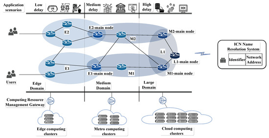 The architecture is illustrated in the Figure 1 below. The architecture is built upon an evolutionary type of ICN that ensures compatibility with the current TCP/IP network, as outlined in Section 2.2. The architecture comprises several key entities, including users, network nodes, computing resource management gateway nodes, computing clusters, and the ICN name resolution system. Each entity within the architecture is assigned a unique identifier (ID) and a corresponding network address (NA, such as an IP address), typically in a one-to-many relationship. The ICN name resolution system is responsible for maintaining the mapping between these identifiers and network addresses.
