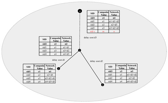 Taking a single domain as an example, as shown in Figure 2 below, nodes 1, 2, and 3 are nodes in the same layer, while node 4 is the master node. Each node stores the service ID (SID), as well as the computing and network status values. Since the focus of this study is to ensure the delay requirement, this paper uses the delay from the computing cluster, where the service instance is located in the current network node as the network status value and the link delay between nodes as the cost in the information announcement process. For each hop, the network status value must add the overhead delay. The delay between nodes can be obtained by timestamping the data packet.