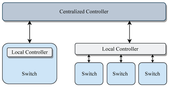 The architecture presented in this paper utilizes SDN technology. It is essential to highlight that the core concept of the SDN is the separation of the control plane from the data plane. In practical deployments, as the scale of the network expands, the logically centralized control plane can no longer be supported by a single physical device. Consequently, the control plane is evolving toward a multi-controller approach, significantly enhancing the scalability and versatility of the SDN. Therefore, this paper adopts a distributed SDN architecture similar to Kandoo [64] and divides the controller into a centralized controller and a local controller. One local controller can be connected to a single switch or to multiple switches. In addition, the deployment location of the local controller is relatively flexible. It can be directly located on the switch or outside the switch. Figure 3 is the corresponding schematic diagram. Considering that the application scenario of this paper is a delay-sensitive service, the local controller is deployed on the switch to better focus on providing scheduling functions. The remaining basic functions of the switch can be managed by the centralized controller in conjunction with the local controller.