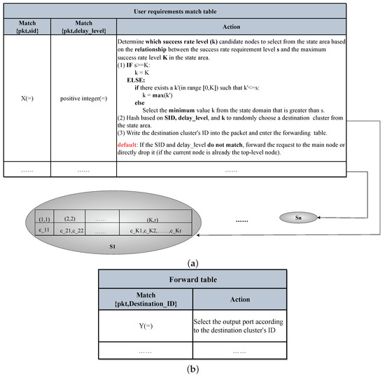 Detailed design of flow tables. (a) Design of the user requirements matching table. (b) Design of the forwarding table.