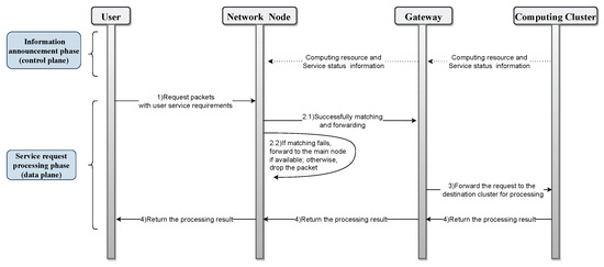 Figure 7 shows the overall scheduling: Assume that each computing cluster has enough service types, the computing cluster information has been exchanged between network nodes, and the control plane has also sent the corresponding flow table to the data plane. When a user generates a service request packet with specific requirements, the scheduling and matching process begins after the packet reaches the network node. If the scheduling is successful at the current network node, the packet is directly forwarded to the gateway of the target computing cluster; if the match fails, the requirement constraints are appropriately relaxed and matched again. If it still fails and the current node is not a top-level node, the packet is forwarded to the upper-level master node for re-matching. If the current node is a top-level node, the scheduling fails. Upon the packet’s arrival at the gateway of the target computing resource management gateway, either local secondary scheduling can be performed, or a random selection of the target computing cluster can be made. Once the computing cluster has processed the request, the result is returned to the user.