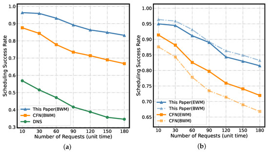 Unlike other schemes that can only select the optimal node, this node uses the SDN data plane’s state area to store candidate computing clusters. Based on the service’s success rate level, the restriction for selecting clusters can be relaxed. For example, when the success rate requirement level is 4, any one of the top-four computing clusters can be selected. This approach reduces the load pressure on the optimal cluster compared to selecting only the best cluster and increases the probability of selecting other computing clusters, thereby improving load balance and resource utilization. In this sense, the network node acts as a load balancer at the network layer, balancing the load among computing clusters while scheduling. At the same time, using the success rate level in the request as a selection parameter instead of a matching field can greatly reduce the size of the flow table and further improve the scalability of the system.