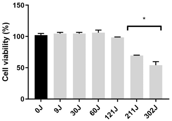 Effects of Photobiomodulation Therapy combined with Static Magnetic Field (PBMT-sMF) on the viability of C2C12 myoblast cells after 3 h of irradiation. * Statistical difference determined by analysis of variance (ANOVA) and Tukey’s post hoc test (p < 0.05) versus control. J = Joules.