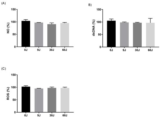 The reduction in NO was 34%, 42%, and 38% for the 9 J, 30 J, and 60 J doses, respectively, compared to the H2O2-treated group (Figure 6C), with statistically significant differences (p = 0.026, p = 0.011, and p = 0.017). Similarly, reductions of 49%, 52%, and 49% in ROS production were observed for the 9 J, 30 J, and 60 J doses, respectively, compared to the H2O2-treated group (Figure 6D), with statistically significant differences (p = 0.005, p = 0.004, and p = 0.005).