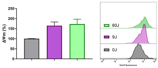 Flow cytometry assays revealed that PBMT-sMF increased the ΔΨm by 65% and 73% at 9 J and 60 J doses, respectively (Figure 4). However, these changes were not statistically significant compared to the control group.
