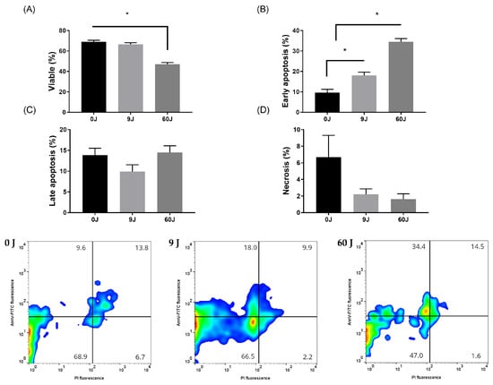 Flow cytometry analysis demonstrated an overall significant difference in viable cells between groups, F (2,9) = 21.99, p < 0.001 (Figure 5). Although the 9 J dose did not reduce the number of viable cells; the higher dose (60 J) resulted in a reduction in this parameter (1.5-fold compared to the negative control, p < 0.05; Figure 5A). The proportion of cells undergoing early apoptosis was significantly higher in all treated groups compared to the control, F (2,9) = 27.01, p < 0.001), with increases of 1.9-fold and 3.6-fold for the 9 J and 60 J doses, respectively (p < 0.05 for both doses; Figure 5B). No significant differences were observed in late apoptosis (Figure 5C) or necrosis (Figure 5D) between the control group and the cells irradiated with PBMT-sMF.