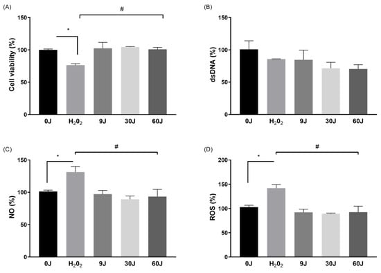 A significant difference was found in the viability between groups, F (3,4) = 33.59, p < 0.002. All tested doses (9 J, 30 J, and 60 J) showed higher viability levels compared to the cytotoxicity induced by H2O2 (102.5 ± 9.19%, p = 0.007; 104.5 ± 0.71%, p = 0.005; and 101 ± 2.82%, p = 0.01, respectively; Figure 6A), and they were similar to the control. However, no significant difference in dsDNA release was observed at any dose compared to the control group or H2O2 group (Figure 6B).