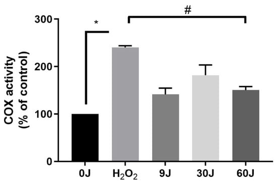 An overall significant difference was found in COX activity between groups, F (4,5) = 38.59, p < 0.0006. Specifically, a significant increase was observed in cells exposed to H2O2 compared to the control (240.36 ± 3.493; p = 0.0004, Figure 7). The PBMT-sMF-irradiated group demonstrated an average reduction of approximately 1.5-fold in COX activity at all doses compared to the H2O2 group, with the maximum reduction (nearly 60%) observed at 9 J, returning to levels similar to baseline (no statistical difference compared to the control; p = 0.083; Figure 7).