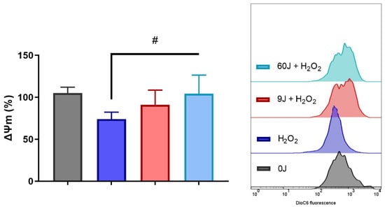 H2O2 did not significantly alter the ΔΨm compared to the control (73.98 ± 8.28; p = 0.541). Both doses (9 J and 60 J) did not differ from the control group in the co-exposure group (91.09 ± 17.50; p = 0.9103 and 104.29 ± 22.17; p = 0.5607, respectively; Figure 8), although both differed from H2O2 (F (5,6) = 10.66, p < 0.006).