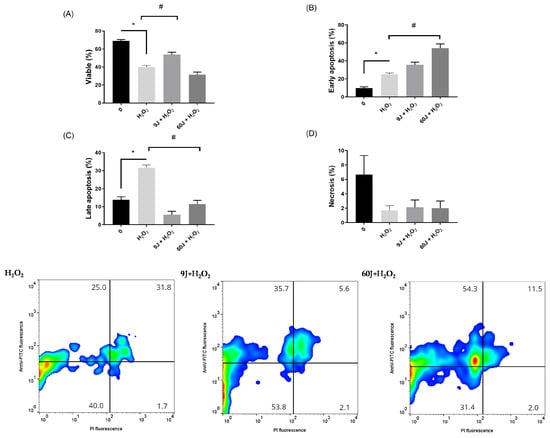 Graphical representation of the detection of (A) viable cells, (B) early apoptosis, (C) late apoptosis, and (D) necrosis in C2C12 cells exposed to Photobiomodulation Therapy Combined with Static Magnetic Field (PBMT-sMF) and simultaneous exposure to hydrogen peroxide (H2O2; 700 µM) by flow cytometry using the Annexin V + PI assay. Representative histogram of viable cells (lower left quadrant), early apoptosis (upper left quadrant), late apoptosis (upper right quadrant), and necrosis (lower right quadrant). * Statistical differences were determined by analysis of variance (ANOVA) and Tukey’s post hoc test (p < 0.05) compared to the control. # Statistical differences were determined by analysis of variance (ANOVA) and Tukey’s post hoc test (p < 0.05) compared to H2O2. J = Joules.
