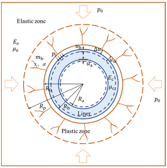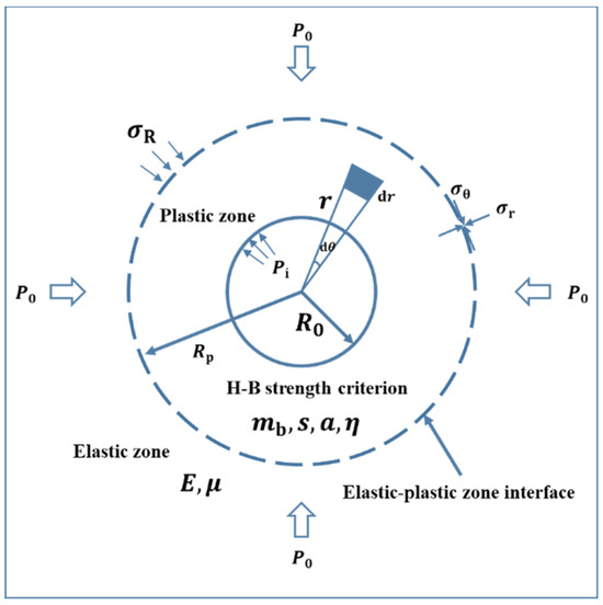 where is the initial stress of surrounding rock; is the radial stress of the elastic-plastic boundary; and is the radius of the plastic zone.