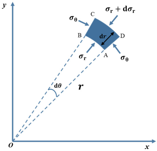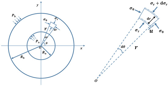 The lining of a circular tunnel typically exhibits a relatively uniform thickness, which necessitates the application of thick-walled tube theory for analysis. The inner radius of the thick-walled cylinder, corresponding to the inner radius of the tunnel lining, is denoted as , while the outer radius, which is the outer radius of the tunnel lining, is denoted as , as illustrated in Figure 3. An infinitesimal unit is taken out at a distance of from the center of the cylinder, and .