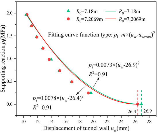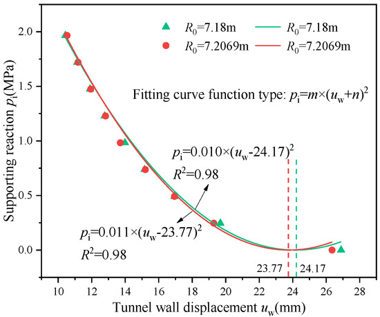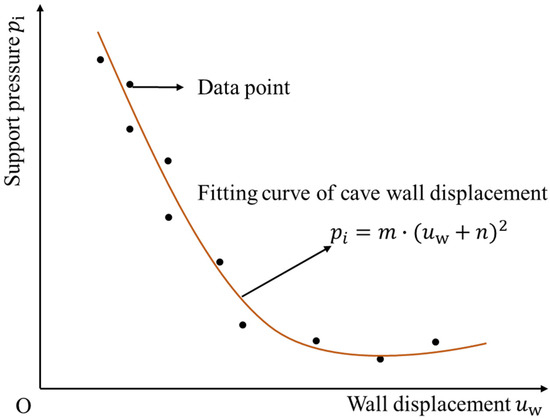 Due to the complexity of the expression relating the tunnel wall displacement to the support pressure in Equation (16), direct computation would be extremely challenging and an inefficient use of computational resources. To simplify the reflection of this relationship, we employed a quadratic function fitting method to approximate the theoretical solution of Equation (16), leading to the derivation of the fitting equation: Equation (20). This equation has been effectively utilized for subsequent derivations, analysis, and calculations. The fitting schematic diagram is shown in Figure 5. This approach ensures a high degree of fit, making it applicable to various rock mass types and tunnel environments, effectively capturing the complex relationships and variations in tunnel deformation.
