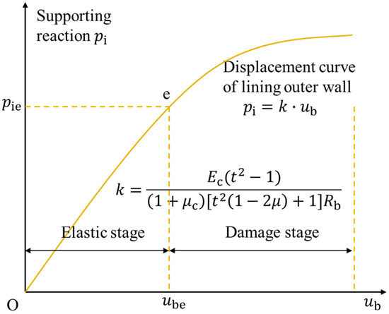 When a concrete lining is subjected to the pressure of the surrounding rock, it undergoes both an elastic stage and a damage stage, as illustrated in Figure 6. During the elastic stage, the support reaction pressure of the lining is proportional to the displacement of the lining’s outer wall, with the lining’s elastic modulus remaining constant. As the support reaction pressure and deformation continue to increase, once the lining deformation surpasses the elastic limit, the concrete lining transitions into the damage stage. In this stage, the elastic modulus of the lining varies with the degree of damage sustained by the lining. Consequently, the relationship between the lining’s deformation and the support reaction pressure is nonlinear.