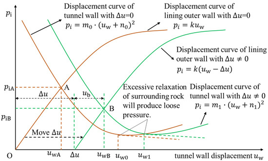 When the reserved deformation between the tunnel wall’s surrounding rock and the lining is neglected (i.e., ), the displacement curve of the lining’s outer wall intersects with that of the tunnel wall at point A. The coordinates of this intersection represent the final radial displacement of the surrounding rock and the interaction pressure with the lining after deformation has stabilized. If the reserved displacement surpasses , the resulting excessive relaxation of the surrounding rock induces loosening pressure, consequently augmenting the load on the lining.
