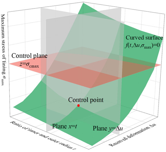 Tunnel lining projects have a strict control on the reserved deformation and lining thickness, as these parameters significantly influence the synergistic deformation between the surrounding rock and the lining. Under different working conditions, different combinations of reserved deformation and lining thickness result in varying maximum compressive stresses within the lining, as illustrated in Figure 8. For a specified combination of the lining’s inner-to-outer radius ratio t and reserved deformation , intersections of planes perpendicular to the x-axis and y-axis with the stress surface coincide at a single point, referred to as the control point in Figure 8. Considering the safety of engineering, the maximum compressive stress in the lining must be less than the project control stress , hence, the control point should lie below the control surface .