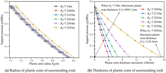 The presence and growth of the plastic zone within the surrounding rock is a critical indicator of tunnel stability. An increase in the thickness of the plastic zone, denoted as H, typically signifies a reduction in rock mass stability, necessitating additional support measures to supply adequate pressure and prevent further deformation or collapse. To elucidate this relationship, the study assesses the correlation between the plastic zone radius Rp of the surrounding rock, the plastic zone thickness H, and the excavation radius R0, as depicted in Figure 9.