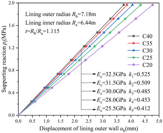 Equation (22) defines the relationship between the supporting reaction pressure and the radial displacement of the lining’s outer wall. Substituting Equation (27) into Equation (22) yields the relationship between the reserved deformation and the radial displacement of the lining’s outer wall: