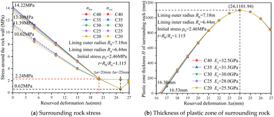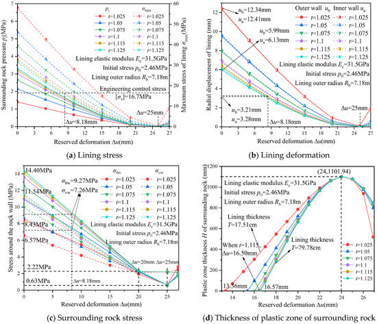 When accounting for the reserved deformation between the surrounding rock and the lining, it follows from Equation (24) that . Substituting this into Equation (22) yields: