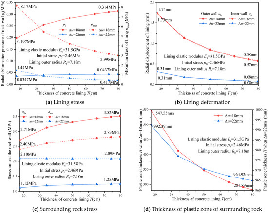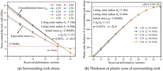 - In comparison, Figure 14 shows a more concentrated curve distribution, where a 7 GPa decrease in concrete elastic modulus results in a 0.92 MPa reduction in hoop stress and a 0.79 MPa decrease in equivalent stress at the tunnel wall, with a corresponding reduction of 0.23 mm under zero plastic zone thickness. This translates to a 0.30% decrease in hoop stress and a 0.31% decrease in equivalent stress for every 1% reduction in the concrete’s elastic modulus, with decreasing by 0.06% under the same plastic zone conditions.