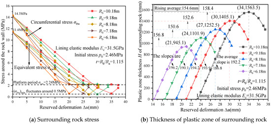 In tunnel engineering, lining design is crucial for ensuring structural integrity and facilitating smooth construction processes. The choice of lining the outer radius significantly influences the interaction with the surrounding rock, thereby impacting construction safety. To thoroughly investigate the impact of lining the outer radius on tunnel stability, this study analyzes how varying outer radii affect the stress at the tunnel wall and the plastic zone thickness under different reserved deformations, as illustrated in Figure 15.
