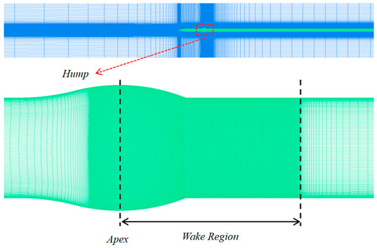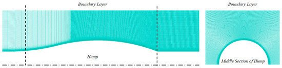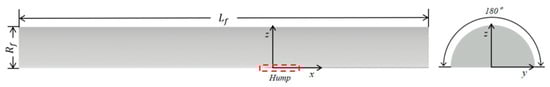 The transonic axisymmetric hump model was designed by Bachalo [14], and the specific data are in [16]. In this paper, the model was simplified to half. According to the research of the quarter model [19,21], for this kind of model with circumferential symmetry and a small cross-flow effect, using half mode for calculation was able to ensure the accuracy of the flow field and reduce the difficulty of calculation. In addition, from the simplified model, it could obtain how the model design influences the IDDES simulation results. Due to no impact of reflective shock wave, the far field boundary was used instead of the tunnel wall.