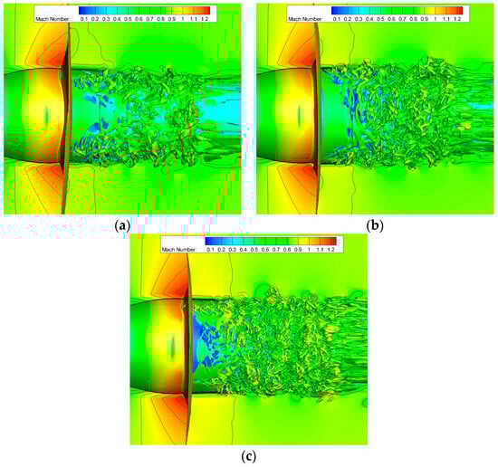 The Q isosurface of half model transient field colored by Mach number for coarse grid (a), medium grid (b), and fine grid (c).