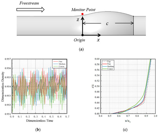 The position of monitor point on the surface of hump (a). Verification of grid resolution with the density variations at the monitor point shown in (b), and the velocity profiles at the location of shown in (c).