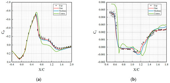 Pressure coefficient and friction coefficient were provided by the experiment and the comparisons are displayed in Figure 7. The error bars of the experiment were plotted in the meanwhile. In Figure 7a, before the peak of negative pressure, all three grid cases fit the experimental data well. At the peak, the negative was much higher in the coarse grid condition, and the results were getting worse after encountering the shock wave; the condition did not become better until greater than 1.6, at which point the position was far away from reattachment point (refer to Figure 7b) and the flow became relatively steady. Looking at the value in the cases of fine grid and medium grid, it performed well whether at the peak or after shock wave. Figure 7b shows the surface friction coefficient. Overall, the simulation results had certain deviations and fluctuations compared to the experiment, a condition observed in many other references [19,21]. These proved that the current CFD methods still have some weakness in the prediction of . In contrast, the errors produced by the coarse grid were more obvious than the fine grid and medium grid. Compared to the specific data in Table 2, the separation points were very close to the experiment in the three cases; however, the significant deviation about reattachment point appeared in the coarse grid.