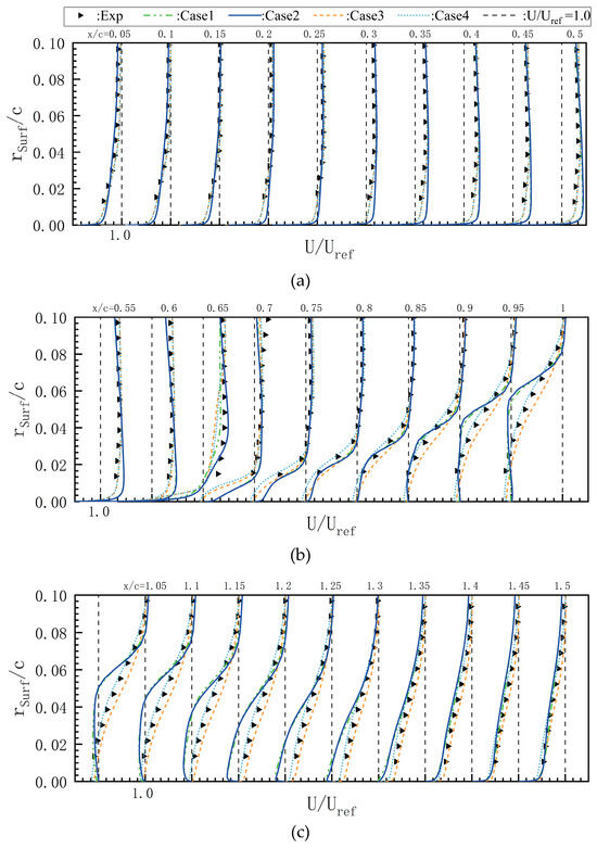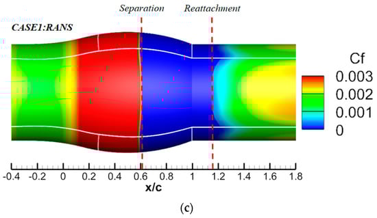 Pressure and friction coefficients on the hump surface intersected by plane are shown in Figure 8a,b. From the perspective of , there were no significant differences in the distribution between Case1 and Case4 before the separation occurred. However, in the separation zone after the shock wave, the four methods began to show some differences. The results of Case1 and Case2 were relatively close, while the results of Case3 and Case4 were relatively close. After exceeded 0.8, the trend of changes in Case3 and Case4 was basically consistent with the experiment, and the at most positions correspond well with the experiment. Although Case1 and Case2 were close to the experimental trend, there was still a significant difference. It was not until x/c exceeded 1.6 that the experimental results gradually became consistent. This may be due to the fact that Case1 uses the RANS method, which cannot simulate the separated flow well. Case2 added transient factors on the basis of Case1, which could improve the accuracy of simulating the flow in the wake region to a certain extent. Case3 and Case4 used RANS method near the wall and LES method far away from the wall in the separation zone, so the simulation of the flow field structure in the wake zone was more accurate and closer to real flow. Therefore, the average results matched the experimental results more closely. For , similar to the results, Case1 and Case2 based on RANS and Case3 and Case4 based on IDDES methods remained consistent but, overall, there were significant differences between these two methods. In the range of from 0.6 to 0.8, Case1 and Case2 showed a clear trend of first decreasing and then increasing, while Case3 and Case4 did not exhibit this characteristic, which may be due to the method itself. As increased, although the calculation results of the four methods were consistent with the experimental trend, the errors became progressively larger. Among them, the errors of Case3 and Case4 are smaller than those of Case1 and Case2, indicating that the IDDES method has stronger simulation ability for separated flow than the RANS method. Based on other references, current simulations of , regardless of the method used, have significant differences from experiments, and this is not an isolated case. The distribution of on the surface of Case1 was described in Figure 8c, and the separation position and reattachment position were clearly observed. These two positions had certain changes along the circumference, especially the reattachment position. This may be mainly due to the unsteady characteristics of the entire flow along the circumferential direction reflected in Case1, and the division of grid blocks may also have a certain impact on the results.