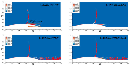 Figure 10 displays the Q isosurface at the section. In four cases, the shock wave was obvious and the -structure appeared at the root of the shock wave, which was fit to other research. The main reason for the appearance of structure may be due to the appearance of secondary waves after the shock wave, but fusion occurred above the two shock waves, ultimately forming this structure. After the shock wave, all four cases generated separated vortices. The difference is that Case1 and Case2 had larger vortex structures, but Case2 had a slightly smaller volume than Case1. On the other hand, Case3 and Case4 had similar vortex structures at the same location but with significantly smaller volumes. In the separation zone, there were a large number of finely divided vortex structures, which were not present in Case1 and Case2. Comparing Case3 and Case4, there were no significant differences between the two methods in capturing vortex structures in the entire wake region, and both demonstrated the ability to simulate fine flow field structures. Through spatial slicing, it can be seen that RANS and URANS methods have a high degree of modeling for separated flow fields and cannot accurately capture small vortex structures, while IDDES and IDDES-SLA methods had a higher degree of refinement. According to the vortex details in four methods, the RANS and URANS were worse in predicting the field details and the instability state of the shear layer. One of the most obvious phenomena was that the size of the rigid vortex after shock wave in RANS and URANS was bigger than the other two DES methods. Although there still was a small degree of modeling in predicting the instability phenomena of the shear layer in IDDES and IDDES-SLA, the description of field details was better. Theoretically, the vortex viscosity of the sub-grid model was smaller than ; thus, the detailed structures of IDDES-SLA in the field were characterized well.