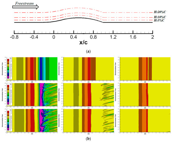 The results from Case2 to 4 exhibited transient characteristics. Monitoring areas were set up at 5%, 10%, and 20% of chord height positions on the surface of the hump in section to monitor the changes in Mach number over time in the range from −0.8 to 2.0. Figure 11a shows the monitor position and Figure 11b shows the contour of Mach number of Case2 to Case4. It can be seen that, in the wake region at the 5% C monitoring position, the Mach number of Case2 fluctuated less with time, while both Case3 and Case4 exhibited strong unsteady fluctuations. At the 10%C monitoring location, Case2 showed no significant fluctuations over time, while the fluctuations in the wake regions of Case3 and Case4 decreased. Near the 20%C, the Mach number fluctuations over time for all three cases were not significant. It can be seen that, at least from the 20%C height outward, the entire flow field mainly exhibited steady characteristics. At the monitoring positions of 10%C and 20%C, there was a high Mach number region near 0.8 to 1.0 in Case2, but the region did not appear at the same position in Case3 and Case4. This region was compressed within a very small range near = 0.8, which may be mainly due to the fact that, although the URANS method has transient characteristics, it cannot accurately simulate the fine flow field structure in the wake region. This also indicated that the IDDES method performs well in simulating the temporal and spatial characteristics of the flow field.