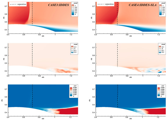 For further comparison, the contour of time-averaged streamwise velocity (u/uref), radial velocity(v/uref), and Reynolds shear stress (u′v′) for Case3 and Case4 are displayed in Figure 12. The difference between Case3 and Case4 in terms of streamwise velocity was mainly reflected in details, and there was not a significant difference in macro aspects. The shock structure shown in Case4 is more pronounced and enlarged, and the overall streamwise velocity in the wake region is slightly lower than that in Case3. In terms of radial velocity, there were significant differences between Case3 and Case4, but the range of the wake region remained basically the same. In terms of Reynolds stress, the macroscopic distribution of Case3 and Case4 was basically the same, but Case4 had a clearer boundary at the shock wave position. From the above comparison, it can be seen that there was no significant difference in the macroscopic distribution simulation results of flow field characteristics between IDDES and IDDES-SLA methods. The difference mainly lay in some details of the flow field, which was mainly due to the improvement of the original IDDES sub-grid discrimination method.