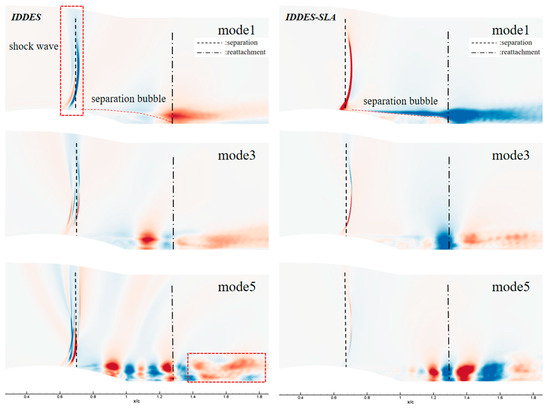 The spatial distribution of POD mode1, mode3, and mode5 of IDDES and IDDES-SLA flow field.