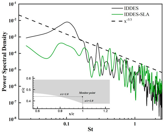 POD method was applied to further compare the flow field resolution capability of IDDES and IDDES-SLA. The dimensionless density was used to perform the POD analysis of 500 flow field snapshots when the flow variation periods were stable. The gap of snapshots was 0.0001 s. Figure 13 showed the POD energy accumulation curve from mode 0 to mode 250 of two methods. It was obvious that the accumulation rate was faster for the IDDES method, where even the energy percent was close to 50% in the first 50 modes, while the IDDES-SLA was about 30%. It could be seen that the curves grow faster in the low modes of IDDES; however, the growth was moderate in the whole 250 modes of IDDES-SLA. This suggested that the change in the sub-grid determination method further improved the ability of the IDDES method to portray the details of the flow field and attenuated the degree of method modeling. The characteristics of low modes would be displayed and recognized more accurately in the IDDES-SLA. Figure 14 shows the spatial distribution of POD mode1, mode3, and mode5 of the IDDES and IDDES-SLA flow field. It should to be noted that the mode coefficients of all POD modes were 1, so the specific value of contours could not explain the meaning of field snapshots. The contours ensured the consistent upper and lower limits. In general, the primary characteristics of three low-level POD modes were similar, which improved the basic features of the flow field consistently. The shape of separation bubbles caused by SWBLIs were marked by a red dotted line in mode 1; the two bubbles was basically the same. This also demonstrated that the two IDDES methods are able to accurately catch the obvious SWBLI field features. The shock wave was marked in mode1 of the IDDES method. Compared with IDDES-SLA, the area was bigger and the period of vibrations was more apparent. This may be due to the deep modeling of the IDDES method, to the extent that the accuracy was reduced in the shock region. The separation line was drawn in the contours. From all contours, the separation position was in a good correlation with the location of the shock wave root in the boundary layer. The separation location of IDDES () was slightly backward compared to IDDES-SLA (); it may be caused by the lager area of shock wave. The reattachment lines were also painted. In mode 5, the vortex structures after the reattachment line of IDDES results were disordered; there was a high probability that the features in this region were deeply modeled. Again, in IDDES-SLA, the regular vibration was shown in the whole weak region. The different results in two methods intuitively demonstrated that the IDDE-SLA method was more accurate in predicting the current transonic SWBLIs flow field. The power spectral density (PSD) of dimensionless density of Strouhal number () from 0.01 to 2 at the monitor point (, ) is displayed in Figure 15. The was determined as , in which means the frequency of dimensionless density after Fast Fourier Transform (FFT) of 500 field snapshots. The length was the chord length of the hump and the was the velocity of the far field. It could be seen that two methods have similar characteristics at , from 0.1 to 1.0; the differences gradually appeared but the slope of all PSD vibration was close to −5/3, which suggested that the resolution of turbulence structures of two methods was credible. After , the PSD of IDDES diverged from −5/3 obviously and the IDDES-SLA still kept the original slope. It was supposed that IDDES-SLA has more credible high-frequency turbulent features, and the method had better resolution capacity for small turbulence structures of the flow field.
