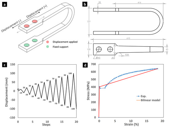 The complete damping system may be composed of multiple USSDs. However, the evaluation of the damper is considered embedded between a lower plate and an upper plate, which is fixed to the structure through bolts. Ansys Workbench 2022 R2 software is used for the simulations. As a boundary condition, the fixed support is applied on the lower bores of the damper, as shown in Figure 1a. The dimensions of the UD-40 model selected are given in Figure 1b. The loads are applied as remote displacement on one axis (Figure 1a) with a 10-cycle load protocol with a maximum displacement of 100 mm in both directions, starting at 10 mm and increasing by 10% per cycle (Figure 1c).