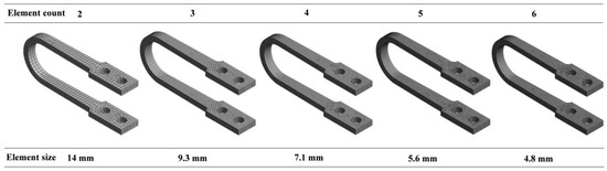 In this case, represents the relative error given by Equation (4), where and are the maximum equivalent stresses of the 4.8 mm size element vs. the maximum equivalent stress of each mesh size model. Furthermore, r is the grid refinement ratio; then, and are the two grids, where represents the finest one. Finally, p is the grade of the method. Equation (6) seeks the minimum error through the results given from the grids and . The result of these equations gives the convergence point [36]. When a second order is assumed (the error is reduced quadratically), the minimum error is given by: