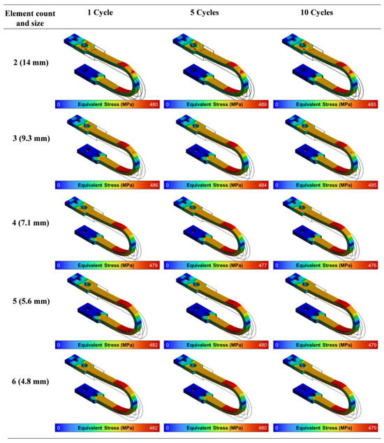 The mesh convergence analysis is based on the element quantity in the damper thickness. For each mesh size and number of cycles, the contour plot of the equivalent stress is shown. With the reduction in the size of the elements, the fields of stress, represented by colors, clearly differ in the areas where the maximum equivalent stress is produced (Figure 3). This localized zone is also important when studying the convergence of numerical results, as the gradient should be accurately reproduced and the variation in the results should be minimized when refinement is performed. The maximum stresses between the last two fine-mesh simulations are approximately the same. Note that the number of cycles does not create a significant difference in the stress fields, which is expected since the material is characterized by low strain hardening.