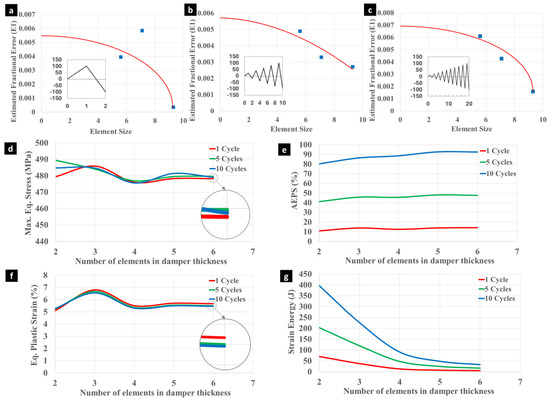 Mesh convergence analysis of (a) estimated fractional error (E1) vs. element size for 1 cycle, (b) 5 cycles, and (c) 10 cycles. (d) Maximum equivalent stress, (e) AEPS, (f) equivalent plastic strain, and (g) strain energy vs. number of elements in the damper thickness.