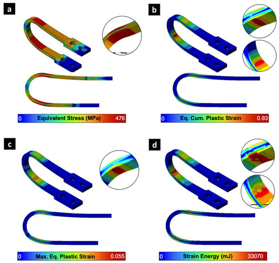 The computational results of stress fields, considering the maximum displacement applied in the load protocol, identify the highest stress levels between the curved and arms zones of the damper (Figure 5a). These results indicate that the head of the damper, where the bores are located, despite displaying mid-to-high stress levels, does not significantly impact the geometry, as it remains within its elastic zone. Figure 5b shows that the AEPS of the damper, with a maximum value of 93%, is also concentrated in a very localized part of the damper between the curve and the arms parts. The maximum equivalent stress of 476 MPa is lower than the ultimate tensile stress of the material, which is correlated with the maximum strain value of 5.5% (Figure 5c). When analyzing the reference bilinear curve of effective stress–strain values, the von Mises equivalent values shown in Figure 5a are coincident with the local strain values of Figure 5c. Additionally, the strain energy fields depicted in Figure 5d show the maximum values located in very small zones where the maximum stresses occur. This behavior is confirmed by other research, with maximum localized deformation in the damping section [15,26,38], while the trends in the through-thickness have only been found in [26].