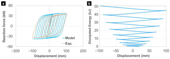 Reaction forces, energy dissipation, stiffness properties, and overall performance under cyclic loading conditions are computed from the hysteresis curve (Figure 6a). This curve compares the reaction forces at the lower bolts against the applied displacements. The bilinear behavior assigned to the material reveals a nonlinear model prediction when the loop is examined. This is attributed to the inhomogeneity of local stress behavior; while some parts are under elasticity, localized zones reach plasticity, converting the overall performance to nonlinear. The symmetrical skeleton curve from the force peaks at the end of each load step is attributed to isotropic hardening. The predicted increasing peak force at the end of each cycle is due to the hardening behavior that alters the yield limit of the material with each load. To validate the numerical model, the hysteresis curve is compared in Figure 6a with experimental data from Suzuki et al. [19]. Their experiments involved testing UD-40 damper specimens with similar dimensions, fabricated from JIS SM490 steel, under horizontal cyclic loading. The specimens were fixed at their upper and lower ends to a horizontal axial machine using bolted connections. A 500-kN actuator applied sinusoidal displacement-controlled loading at an average speed of 10 mm/s and amplitudes of 10, 30, 50, and 100 mm. Displacement measurements were acquired using wire displacement transducers located in the upper supporting beam, while load measurements were obtained using a built-in load cell located below the lower plate.