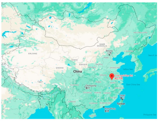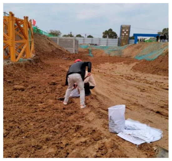 The soil samples were obtained from Hefei, Anhui Province, East China, which has a subtropical humid climate with an average annual precipitation of 900–1000 mm. The soil sample was approximately 0.5 m below ground level and was brownish-yellow, ranging from plastic to soft plastic. The sampling locations are shown in Figure 1. Figure 2 shows the sampling site.